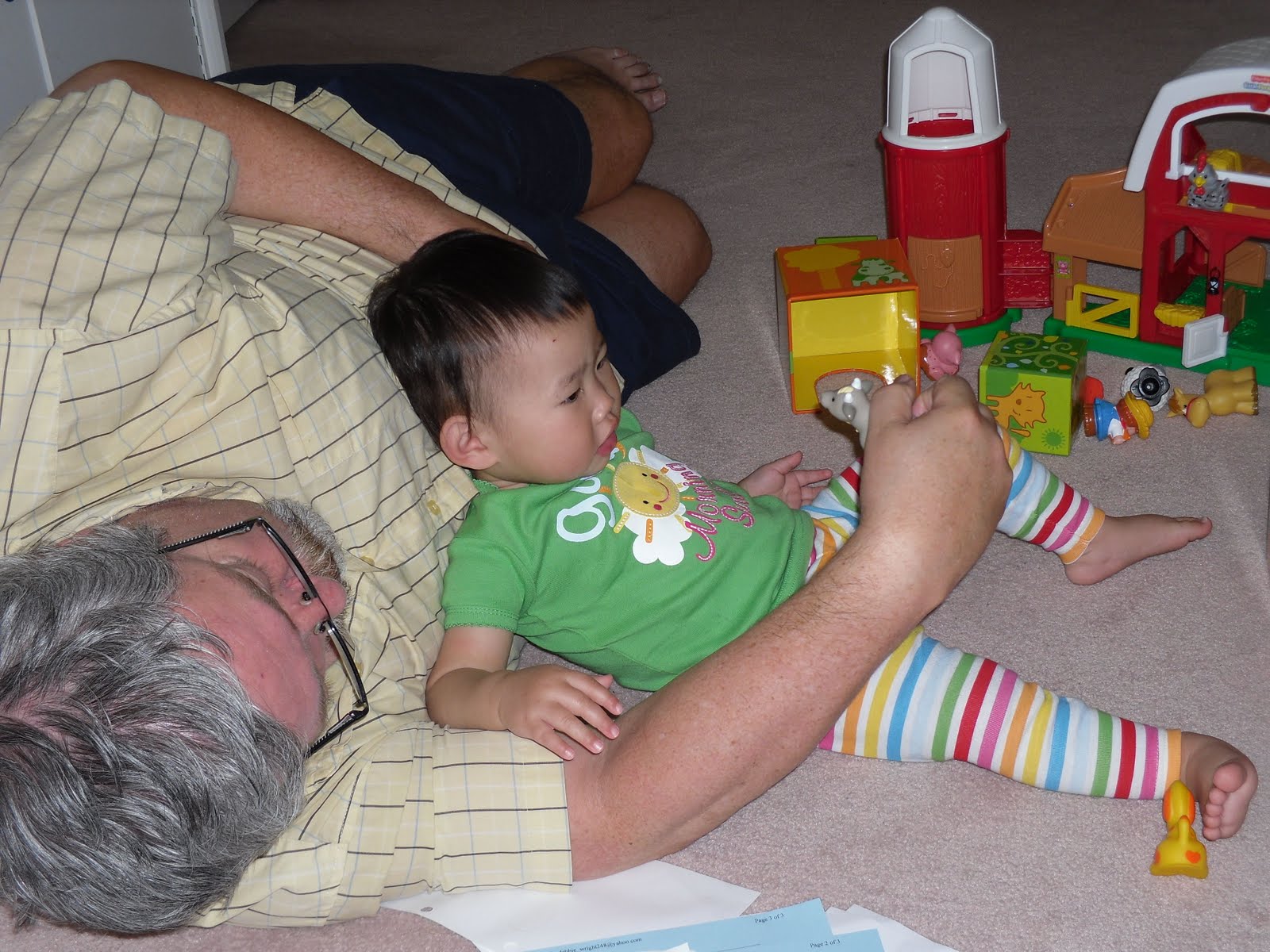 Charlotte has discovered how to pull both pull-toys at the same time, without them toppling over. Later in the morning, she discovered that she can multi-task by putting the string of one pull-toy in her mouth to free up both hands to pull two additional toys. She had daddy in stitches.